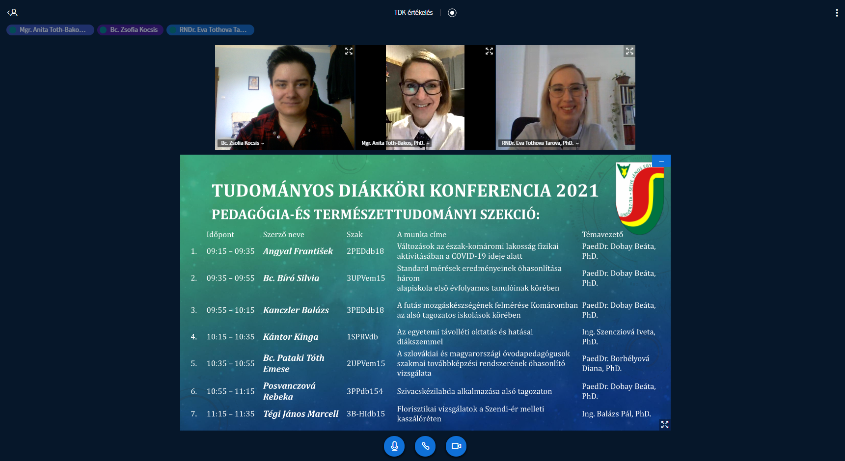 2021. április 21-én a XVI. Komáromi Egyetemi Napok keretében került sor a Tudományos Diákköri Konferencia (TDK) egyetemi fordulójára. Az esemény a járványhelyzetre való tekintettel online formában, a BigBlueButton felületén valósult meg. A Tanárképző Kar hallgatóinak munkái két szekcióban kerültek bemutatásra. A Pedagógia- és természettudományi szekcióban hét, a Történelem- és irodalomtudományi szekcióban pedig hat előadás hangzott el.