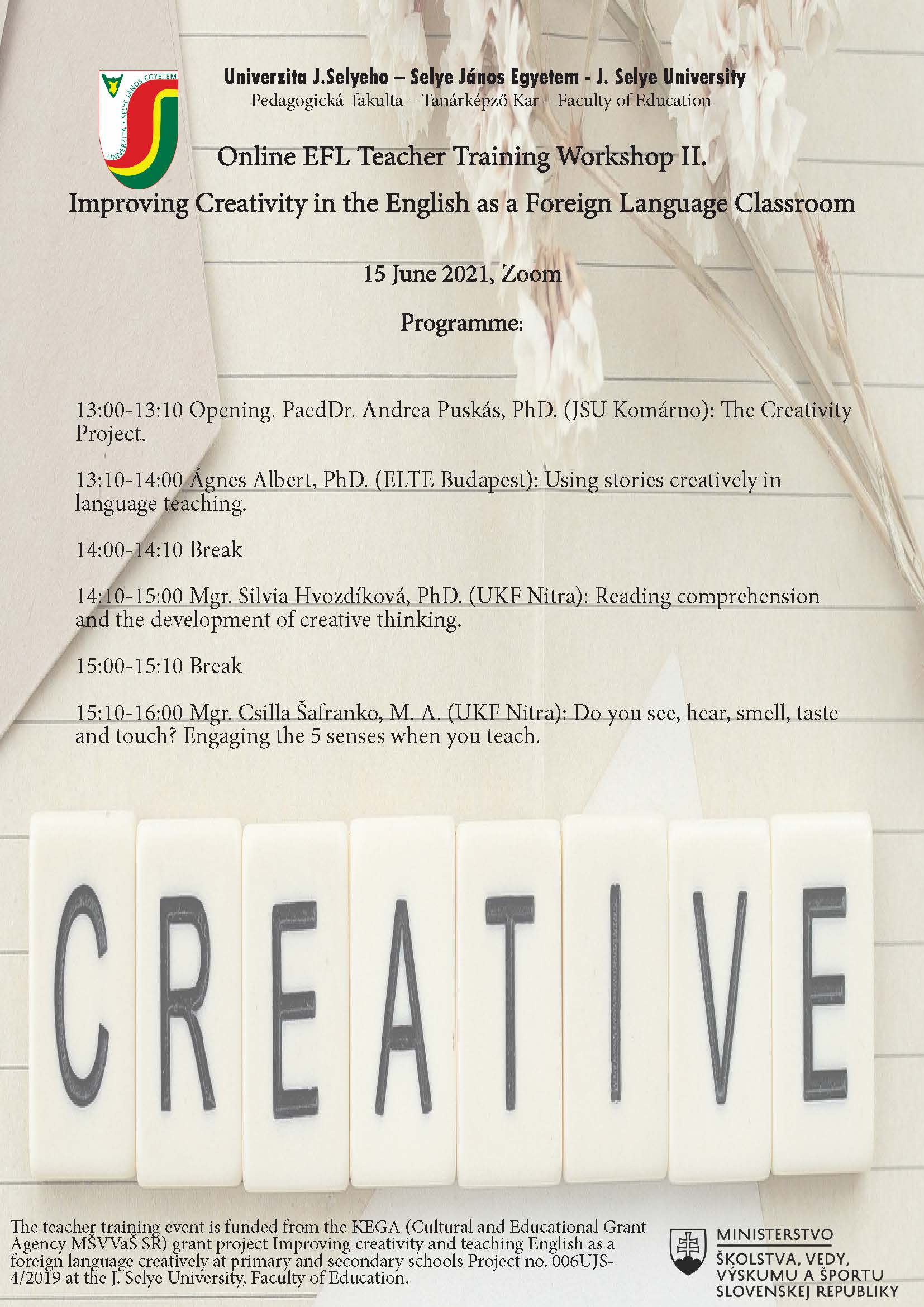 Kedves Kollégák! Szeretettel meghívjuk Önöket az „EFL Teacher Training Workshop III. Improving Creativity in the English as a Foreign Language Classroom” c. workshopra.