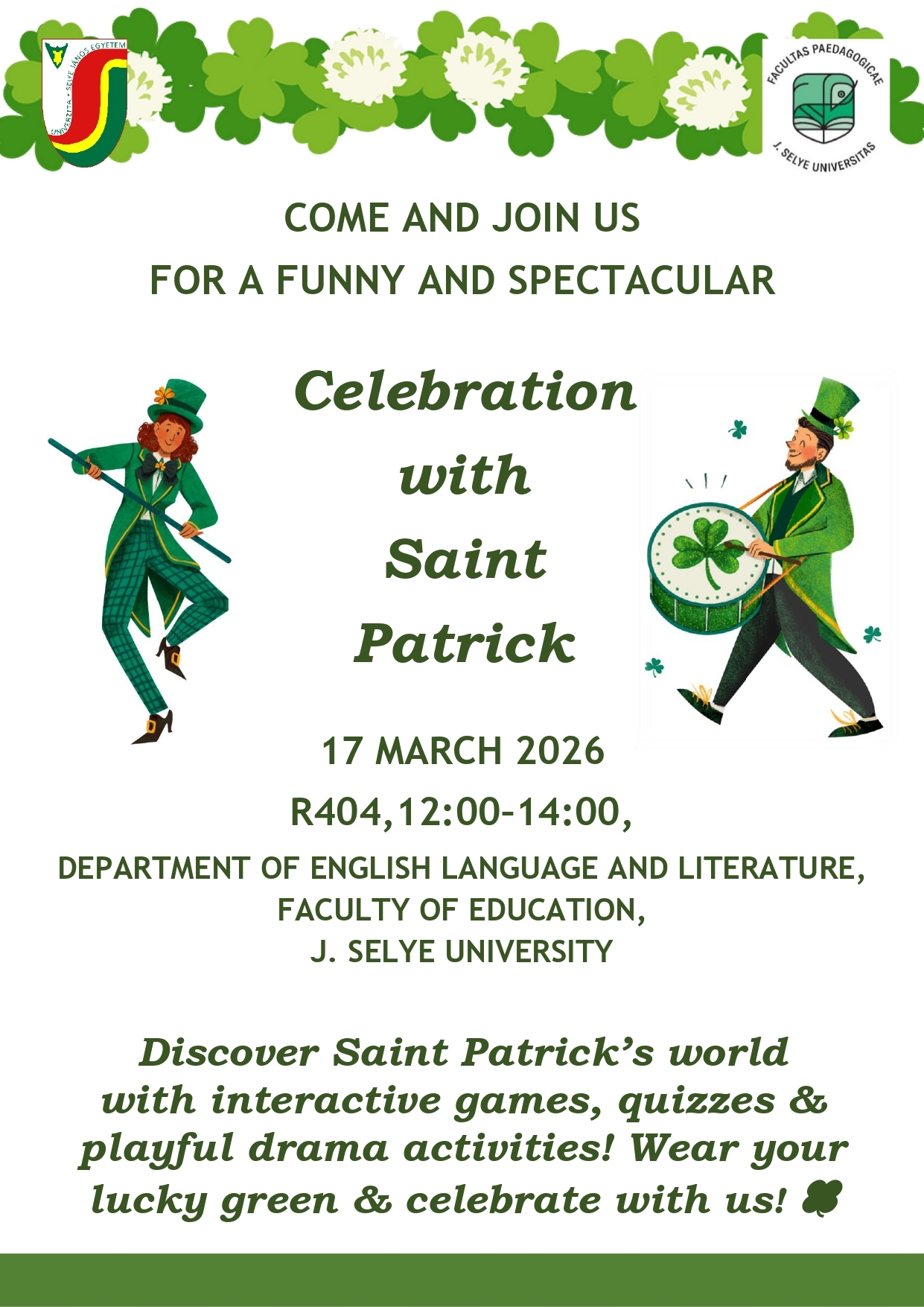 2019. november 11-én az SJE Tanárképző Kar Angol Nyelv és Irodalom Tanszéke továbbképzést szervez alap- és középiskolai angoltanárok részére „EFL Teacher Training Workshop I. Improving Creativity in the English as a Foreign Language Classroom” címmel. A workshop keretén belül drámatechnikák és egyéb kreatív és innovatív tanítási formák kerülnek bemutatásra az angol, mint idegen nyelv oktatásában. Program