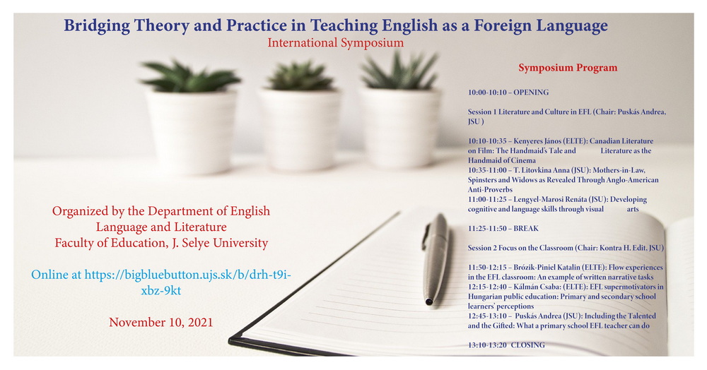 A szimpózium azokra a legújabb trendekre és változásokra összpontosít, amelyekkel az angol, mint idegennyelv oktatásának a Covid alatti és utáni időszakban szembe kellett néznie. A fő témakörök azokat a nehézségeket és kihívásokat vizsgálják, amelyekkel az angoltanároknak meg kellett küzdeniük, elhangoznak megoldási javaslatok, valamint olyan innovatív ötletek, melyek gyakorlati megoldásokat nyújthatnak. Az angol nyelv, irodalom és kultúra oktatásának módszertanáról Szlovákiából és Magyarországról érkező szakemberek tartanak előadásokat.