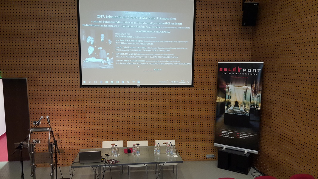 Pri príležitosti 70. výročia podpísania Parížskej mierovej zmluvy sa organizovala konferencia v maďarskom Hódmezővásárhely. Účastníkmi konferencie boli akademik Ignác Romsics, Tamás László Vizi, László Gulyás (Univerzita Szeged) a docent našej Katedry histórie Barnabás Vajda. Okrem prednášateľov na snímke je prítomný aj riaditeľ vedeckého centra Péter Miklós.