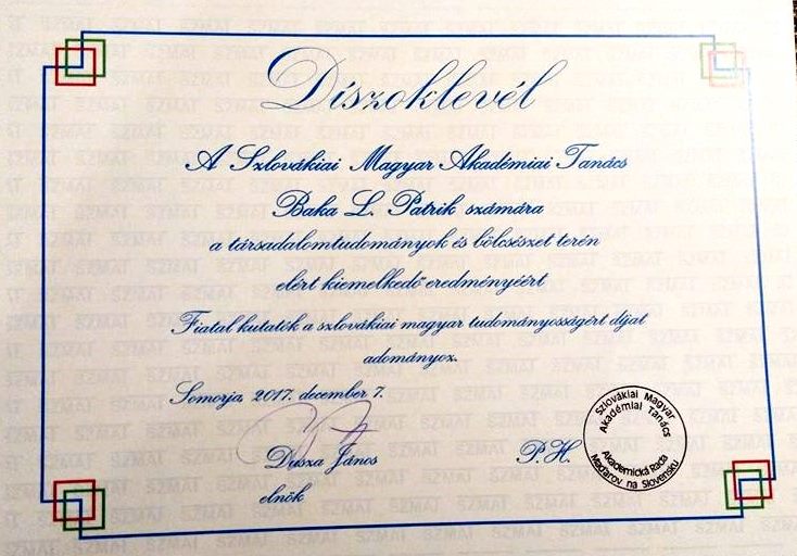 07.12.2017 Akademická rada Maďarov na Slovensku (ARMS) každý rok udeľuje ocenenie Fiatal kutatók a szlovákiai magyar tudományosságért pre mladých nadaných maďarských vedcov. Podľa rozhodnutia kuratória v roku 2017 ho dostal v kategórii spoločenské vedy a filozofia doktorand katedry Maďarského jazyka a literatúry Pedagogickej fakulty Univerzity J. Selyeho Patrik L. Baka. Ocenenie mu bolo pridelené za svoju rozsiahlu vedeckú činnosť.