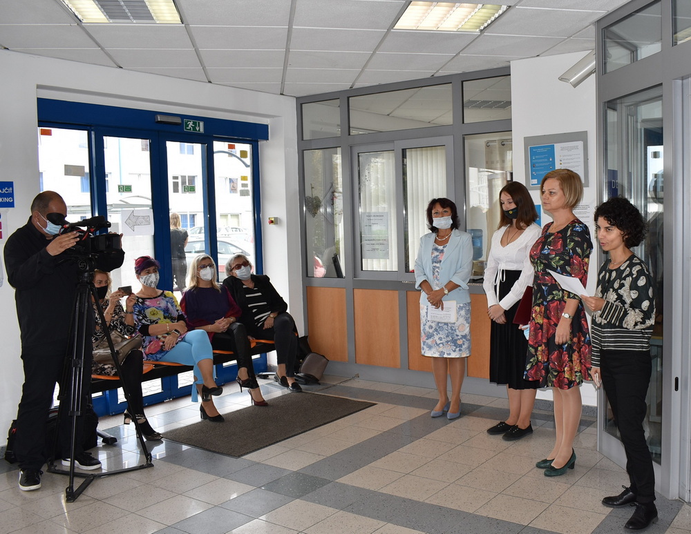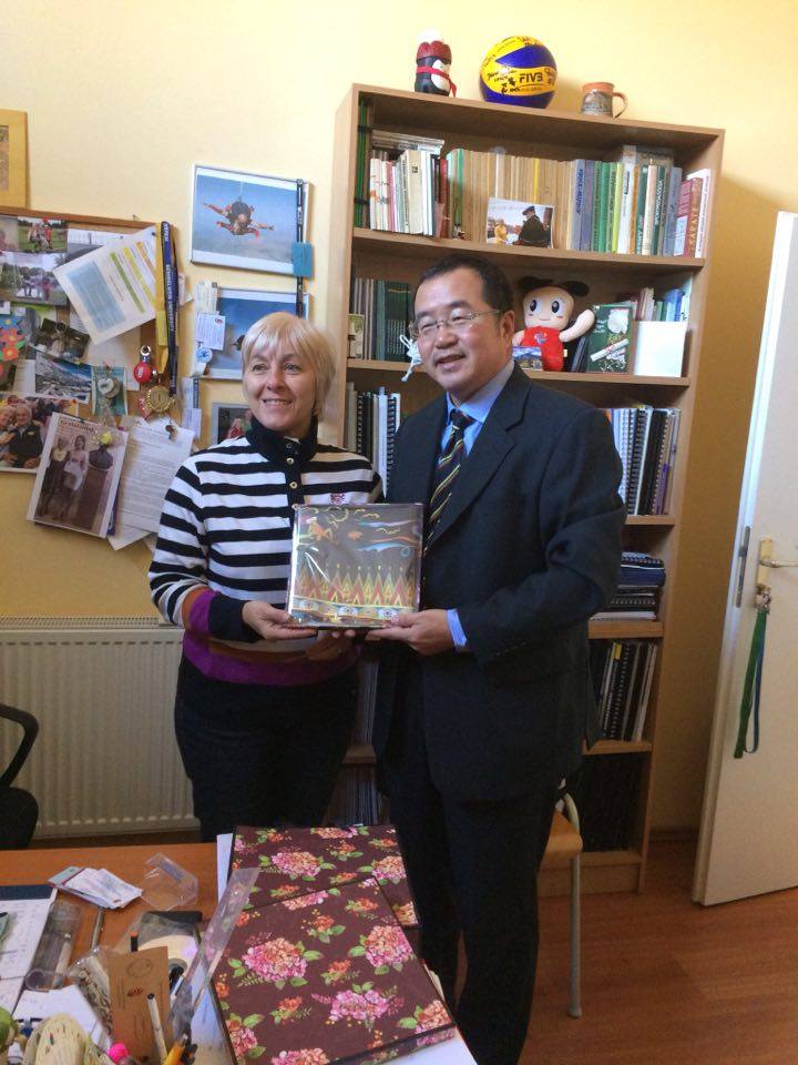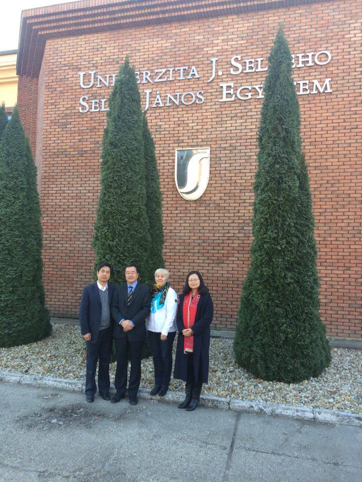 Na Univerzite UJS v Komárne vedúca katedry telesnej výchovy a športu, PaedDr. Beáta Dobay, PhD. a prodekan Pedagogickej fakulty pre rozvoj a medzinárodne vzťahy Dr. habil Ing. István Szőköl, PhD. privítali vzácnych čínskych profesorov: Zhou Lijun, profesor, vedúci Katedry športových vied Univerzity Zhejiang, Wang Jian professor a Zhou Yongping profesor.